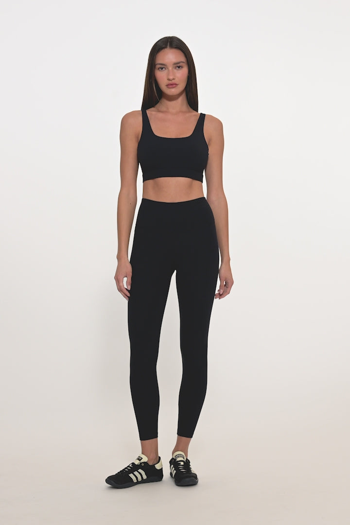 A brand new ribbed airweight fabric in a super supportive silhouette featuring a scoop neckline in moisture wicking fabric. Pair it with the matching Airweight Rib High Waist 7/8 Legging.